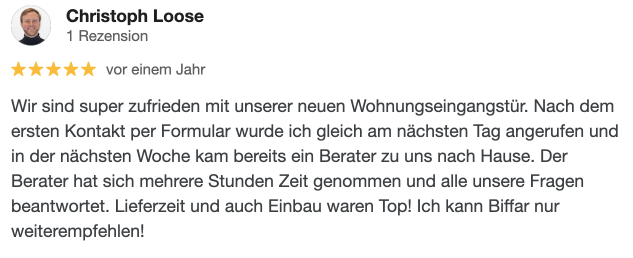 Noch unsicher, ob ein Biffar-Vordach die richtige Wahl ist? Unsere Kunden waren es auch – bis sie sich von der Qualität, dem Service und der Sicherheit selbst überzeugt haben. Lesen Sie, wie Biffar nicht nur Erwartungen erfüllt, sondern übertrifft. Denn zufriedene Kunden sind für uns die beste Empfehlung.